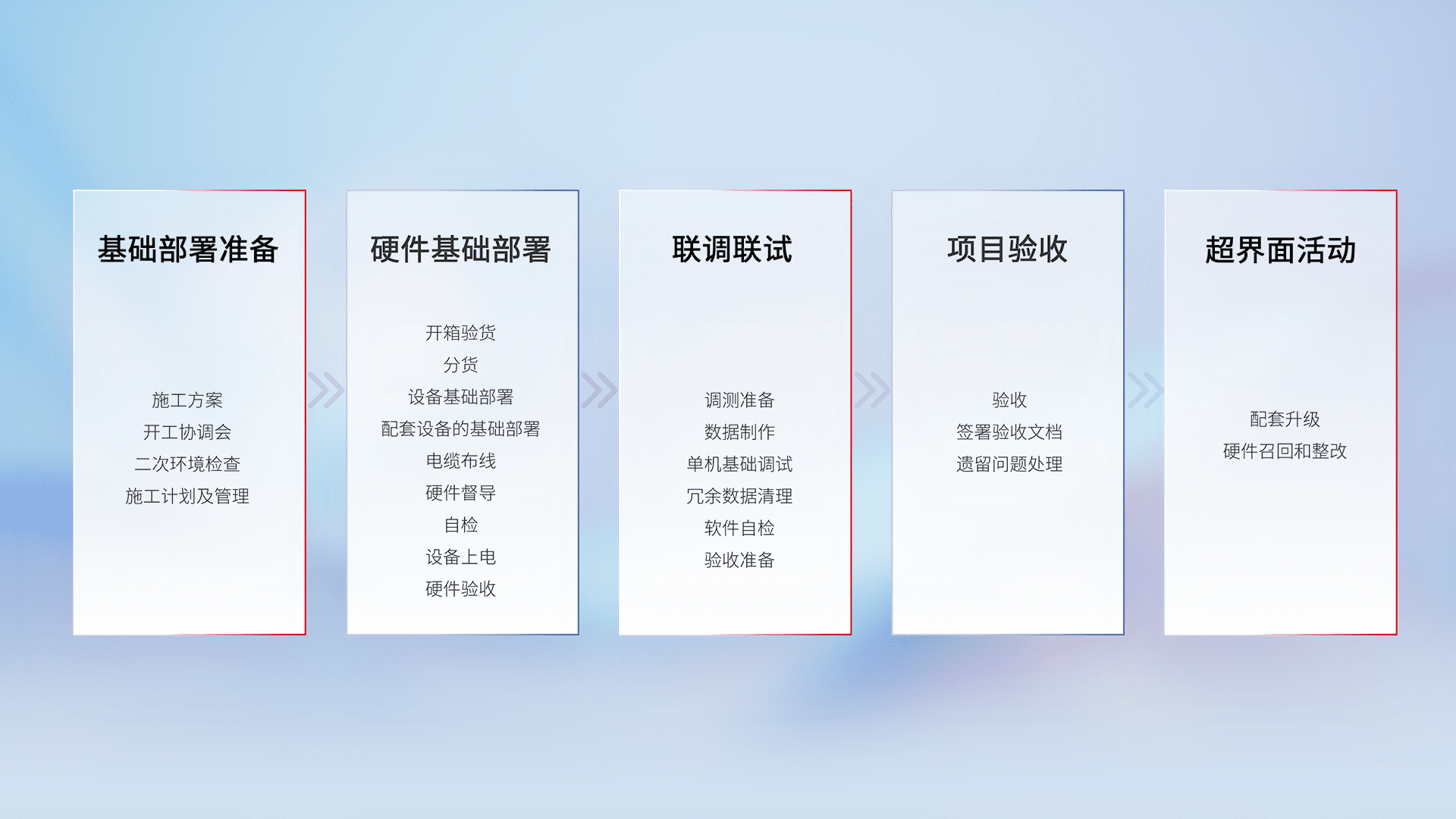 从基础部署准备、、硬件基础部署、、、、联调联试、、、、项目验收、、越界面活动的全过程可追溯,,,保证施工质量和进度。。